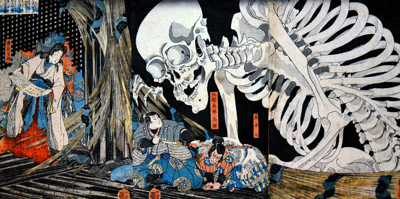 之所以會將國芳館排入此次行程,起初是因為在日本人的部落格中偶然發現這個景點。雖然我對浮世繪並不算熟悉,卻恰好對歌川國芳的作品有點印象,最深刻的記憶,來自《妖怪少爺 京都篇》中出現的那幅巨大骷髏,當初在動畫裡看到時,簡直大為震撼,巨大骷髏的妖異美感,讓我留下深刻印象,因此當我在日本部落格中看到國芳館有這幅作品,便毫不猶豫地將它納入旅程中。