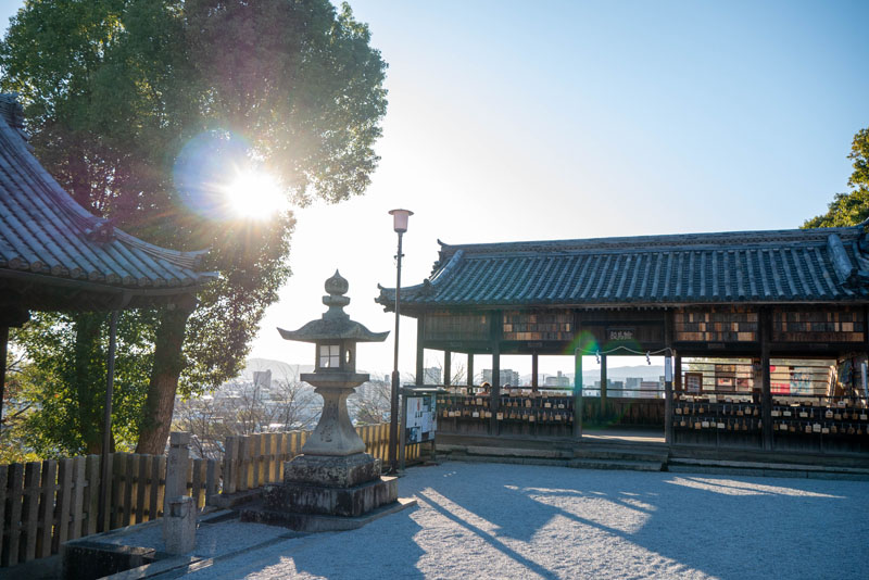 後來也有爬上阿智神社,從更高處拍攝倉敷全景,事先做過功課,這邊是我很期待的拍攝地之一,但不得不說,這邊反而太高了,視野雖然寬廣,卻混入了許多現代建物、鐵皮屋與電線桿等雜訊,讓畫面有些破碎,猶豫很久,最後還是放棄拍攝這高度的倉敷全景,反倒是下午時分的阿智神社更別具浪漫氣氛。