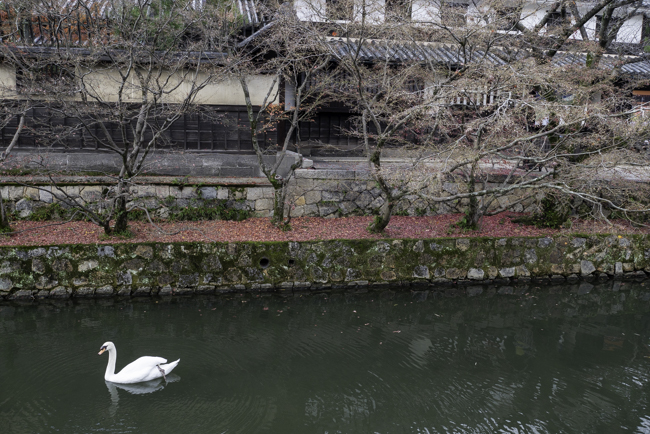 大原本邸外頭是倉敷川流經,所以只要沿著河流的上頭走也是會走到目的地的,順帶一提這一帶的倉敷川還有天鵝悠遊著,不知道為什麼牠們只會在大原本邸外頭的這一小段河川內移動,觀察頗久,牠們都無意往下方移動。