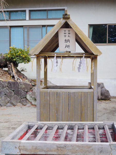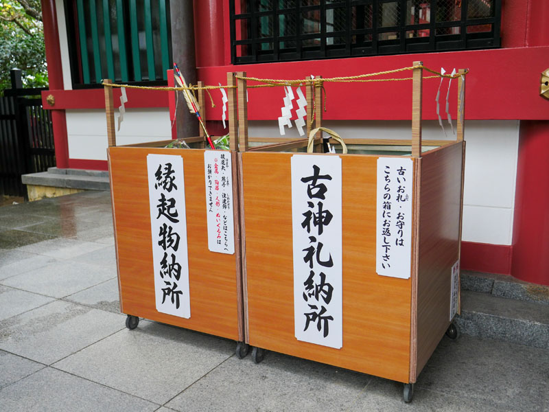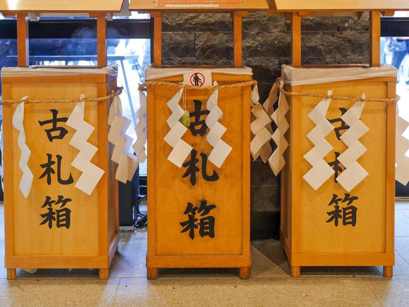 而最重要的古札納所也不難找,就設在社務所前,面對主參道時的右手邊,位置清楚明顯,非常方便要回收御守或神札的參拜者使用。前面的香油箱,可以投幣進去當作感謝神社人員的小心意。
