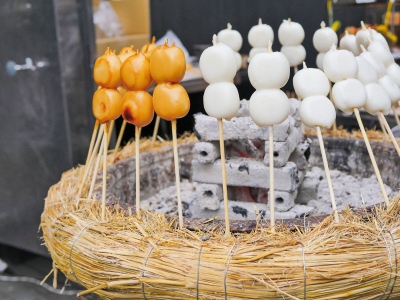 或許是因為神社本身的氣場夠強,也或許是因為人潮太多讓我來不及沉浸在低氣壓裡,總之原本因鏡頭摔壞而低落的情緒,在這裡竟然完全沒發作,且後來更在神社入口鳥居旁的鳥居の結び葉,這家甜點店居然有賣我最喜歡的烤糰子,之前在東京世田谷ボロ市有遇到過,毫不猶豫地買了一串,咬下去的那一刻,柑橘醬油甜味和團子本身溫度瞬間把我整個人包住,心情也隨之鬆開了。