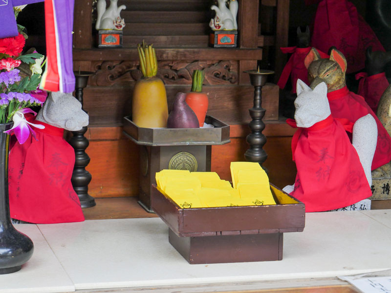 這裡最有名的就是「融通稻荷」,看到好多日本人在參拜,立即搜尋相關資訊,才知道原來參拜後能會獲得一枚裝有10日圓硬幣的袋子,據說將裝有硬幣的紙袋放進錢包,就能為財運開啟通路,之後真的有所收穫,一年後記得要連本帶利再回來還願,投入香油錢以示感謝。於是我在旁邊看著日本人怎麼參拜,依樣畫葫蘆也帶一枚回來,期許未來有機會能常常去還願。